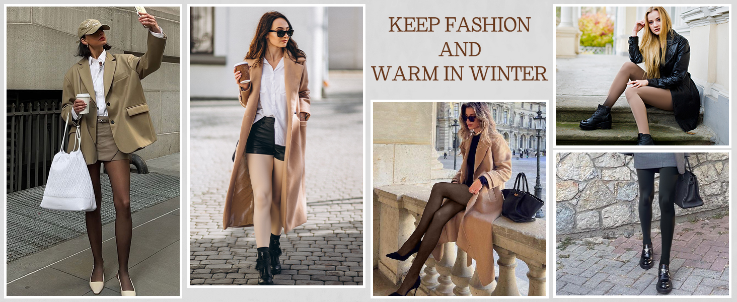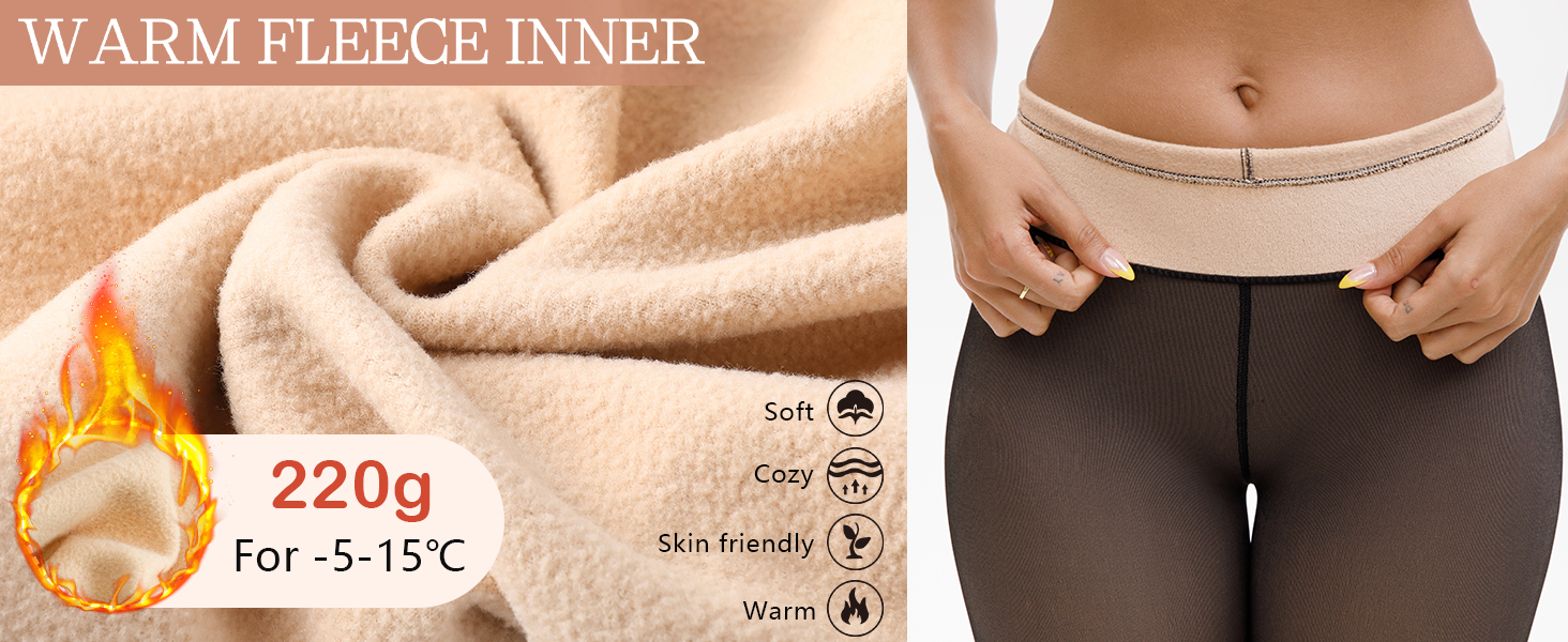 · 73% Polyester,16% Nylon,11% Spandex. Fleece lined tights are made of soft, stretchy fabric for comfortable, lint-free, baby-soft skin. · Fleece lining: The leggings feature a soft fleece lining that effectively traps heat, keeping your legs warm even in cold winter weather, while the plush texture enhances overall comfort. · Machine washabFaux transparent design: The leggings feature a finely crafted faux transparent weave, giving them a see-through appearance while actually incorporating an additional layer for warmth. This design perfectly combines fashion with functionality.e or hand washable. · Thicker material: Made from premium, thicker fabric, these leggings enhance warmth and durability. This makes them ideal for winter wear and daily activities. · Slim fit design: Featuring high elasticity and precise tailoring, these leggings conform closely to the leg's contours, perfectly showcasing the leg line while preventing issues like slipping or sagging common with traditional leggings. · Four-way stretch: The fabric offers four-way stretch, allowing it to move with your body and fit various body types comfortably. This enhances mobility and is ideal for everyday wear and diverse activities.