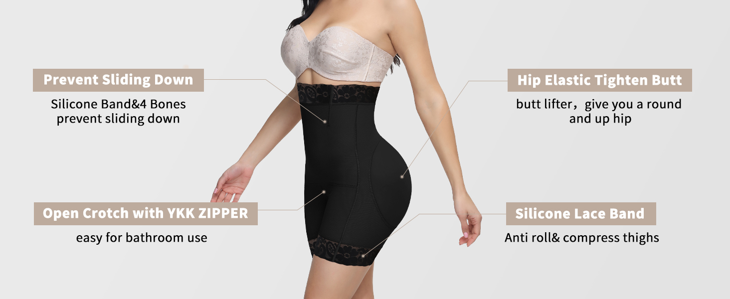 - Stay in place: We added 4 bones to the waist of the faja shorts to prevent slipping down, and at the same time make the waist of tummy control shapewear have more tension to better fit your waist.The lace part of the waist and thighs is designed with internal glue to be non-slip and not easy to roll up. We've tested these details of our body shaper for women, making our women's shapewear control panties to be the perfect choice for you.