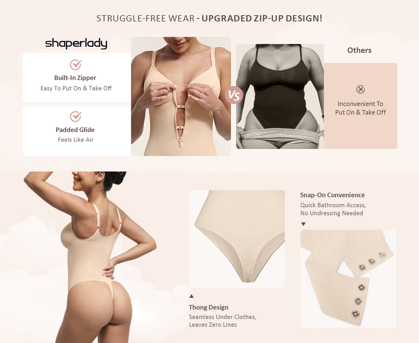 Glide-Free Zipper Upgrade: Reinforced inner zipper with padded lining prevents snagging in tummy control bodyshapers, engineered for quick adjustments.