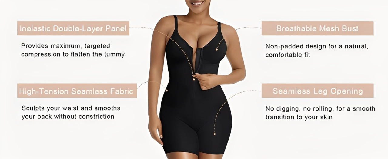 New Arrival !The Shapewear Dilemma is Over. Meet the Future of Sculpting.For too long, you've faced an impossible choice: the barely-there feel of a seamless bodysuit with weak sculpting, or the powerful shaping of a bulky faja that's difficult to wear and impossible to hide. We've engineered a garment that delivers the formidable, tummy-flattening power of a traditional faja with the sleek, comfortable, and versatile beauty of a modern seamless bodysuit.Key Innovations You'll Love:·Faja-Inspired Front Panel: Our game-changing feature is the inelastic, double-layer front closure. The inner row of closures provides a secure, customizable fit, while the outer zipper locks everything in place, creating an unyielding wall of support that smooths and flattens your core like nothing else.·High-sculpting, Easy-Wear Fabric: We use a premium, high-tension seamless yarn that offers incredible sculpting power. The magic is in the zipper—it allows you to easily wear this powerful fabric without the usual struggle, giving you maximum results with minimum effort.·Your Wardrobe's Secret Weapon (Or Centerpiece!): The flawless seamless design ensures it disappears under your clothes, creating a perfectly smooth canvas.